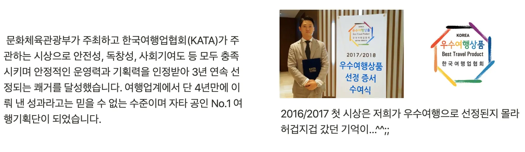 * 문화체육관광부 주관 제 44회 관광진흥유공자 표창 (관광업에 기여함을 인정)