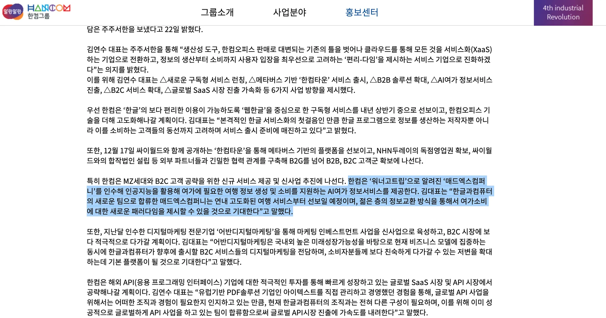 소프트웨어로 유명한 기업 한글과컴퓨터 한컴그룹 계열사 편입 (2022년)