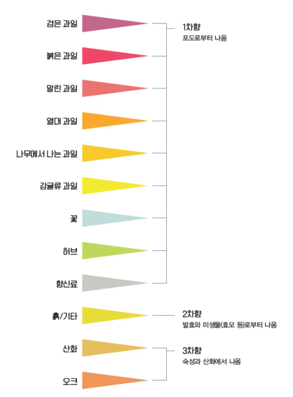 아로마는 오래 숙성되지 않은 와인에서 초기 포도 품종의 향, 주로 과일을 바탕으로 하는 향을 말해요!