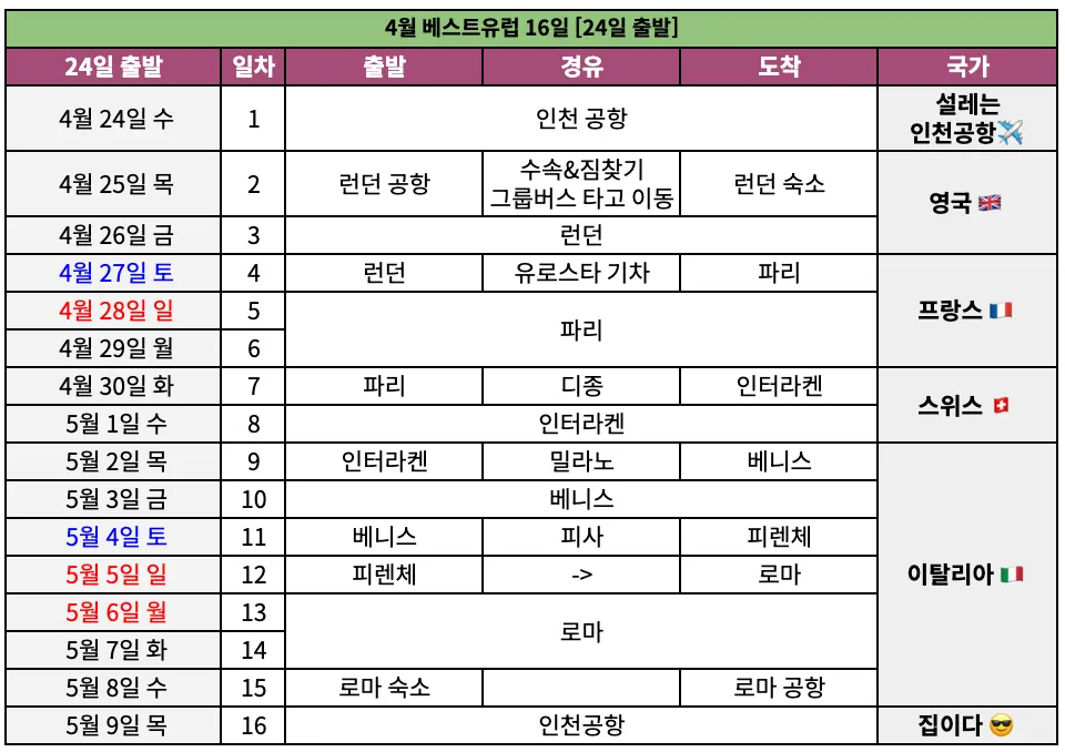 4월 25일 런던 도착 / 5월 8일 로마 출발 일정