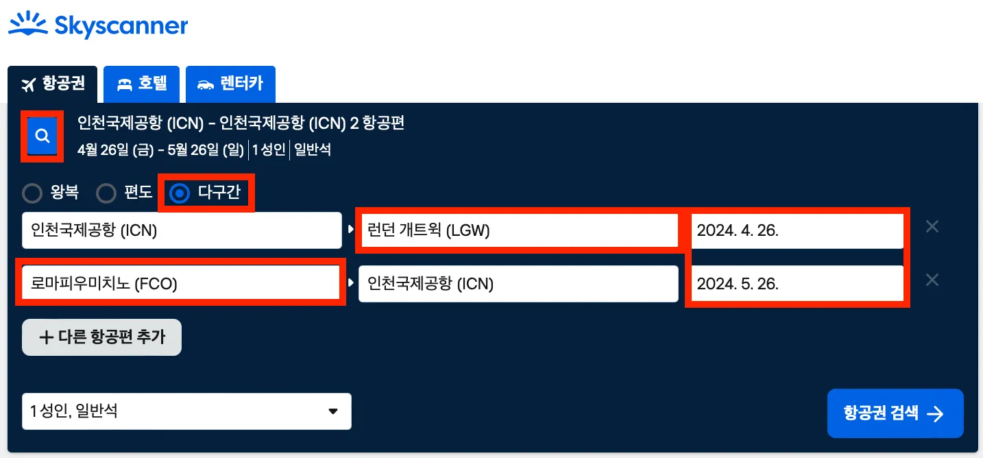 출발 장소 [로마, 바르셀로나 등] → 인천국제공항