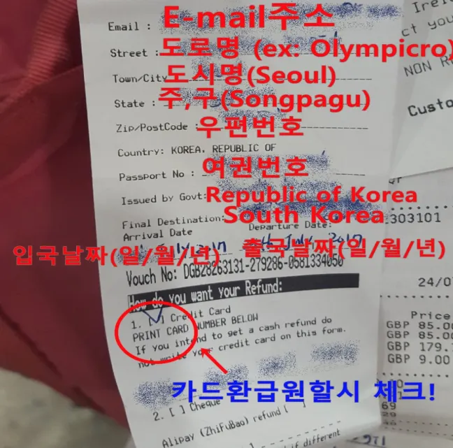 영수증과 택스리펀 서류를 수령하고 추후에 작성