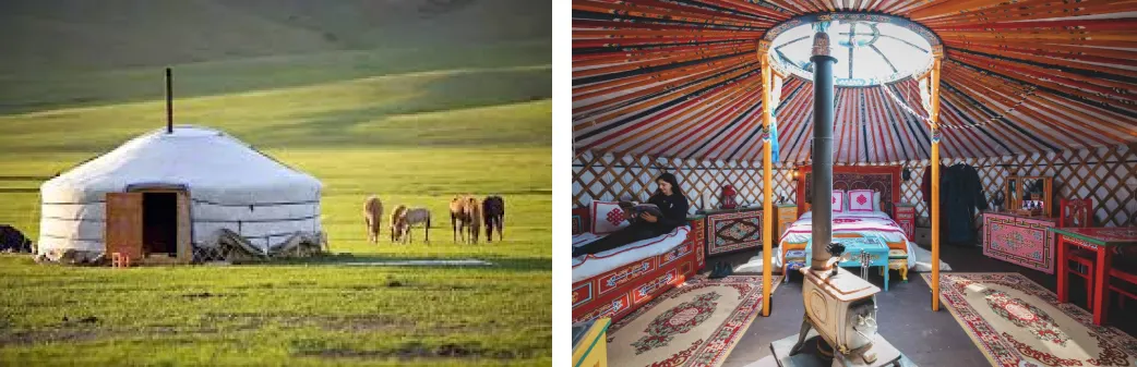 전기 사용과 온수 샤워가 가능한 몽골 게르형 숙소로, 여행자 편의에 맞게 관리되어 유목민 게르보다 깔끔한 숙소입니다.