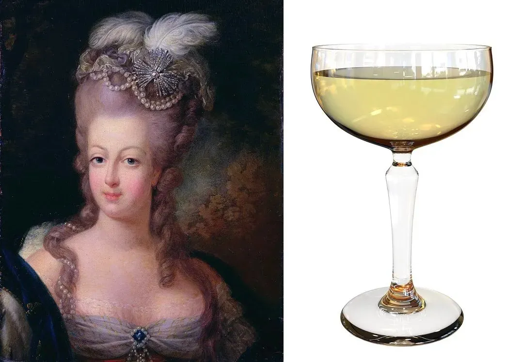 아래 넙적한 샴페인 잔은 ‘쿠페 Coupe’ 라고 불리는데요. 다른 이름으로는 ‘마리 앙뚜아네트’ 입니다. 그녀의 가슴 모양을 본따 만든 잔이라는 이야기가 있답니다.