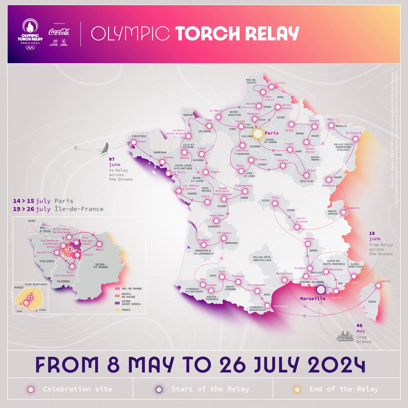 고대 올림픽부터 민중의 평화와 형제애의 상징으로 여겨지는 성화대의 횃불은 이에르의 아름다운 알마나르 해변과 솔트 로드, 베르동 협곡을 거쳐 프로방스와 알프스산맥을 등반하고, 알자스와 노르망디를 거치고, 국경일(혁명기념일)을 맞이하며 파리에 입성해 7월 14일, 15일 양일간 바스티유 광장, 파리 시청, 베르사유 궁전 등 프랑스 도심과 외곽의 주요 장소들을 다녀온 후 26일 파리에서 막을 내립니다.
