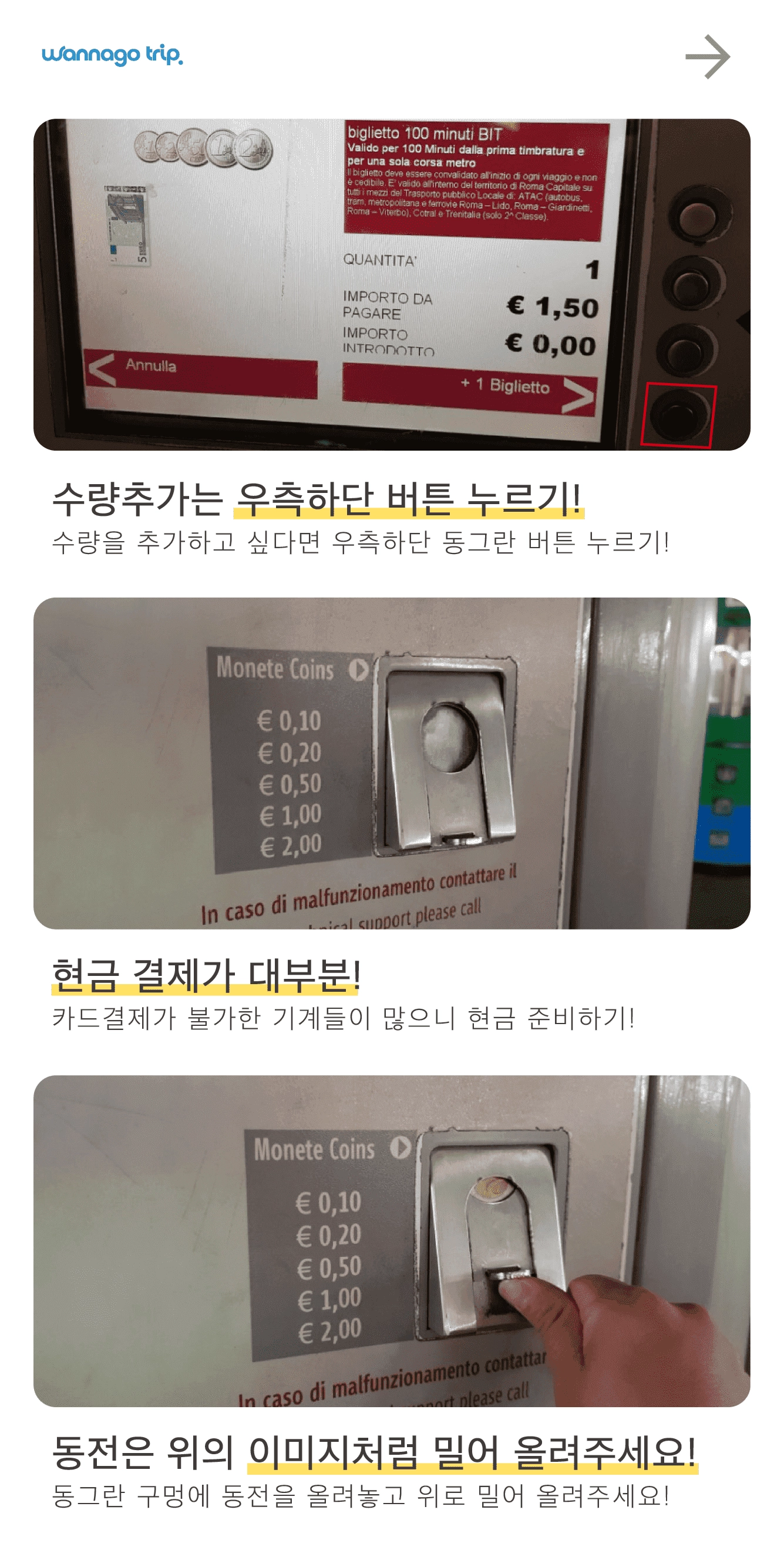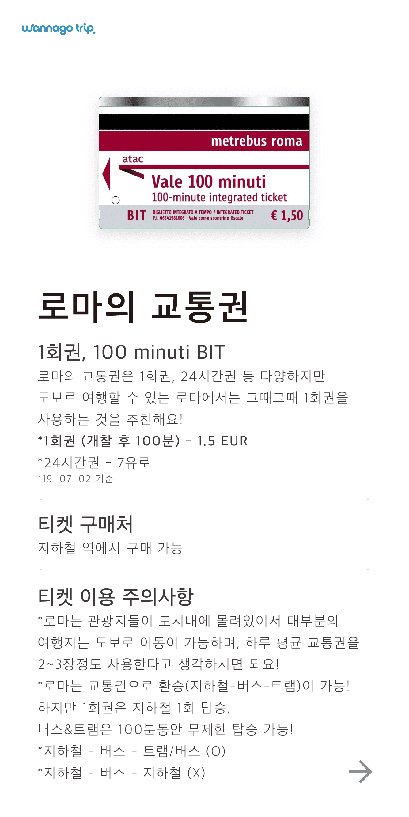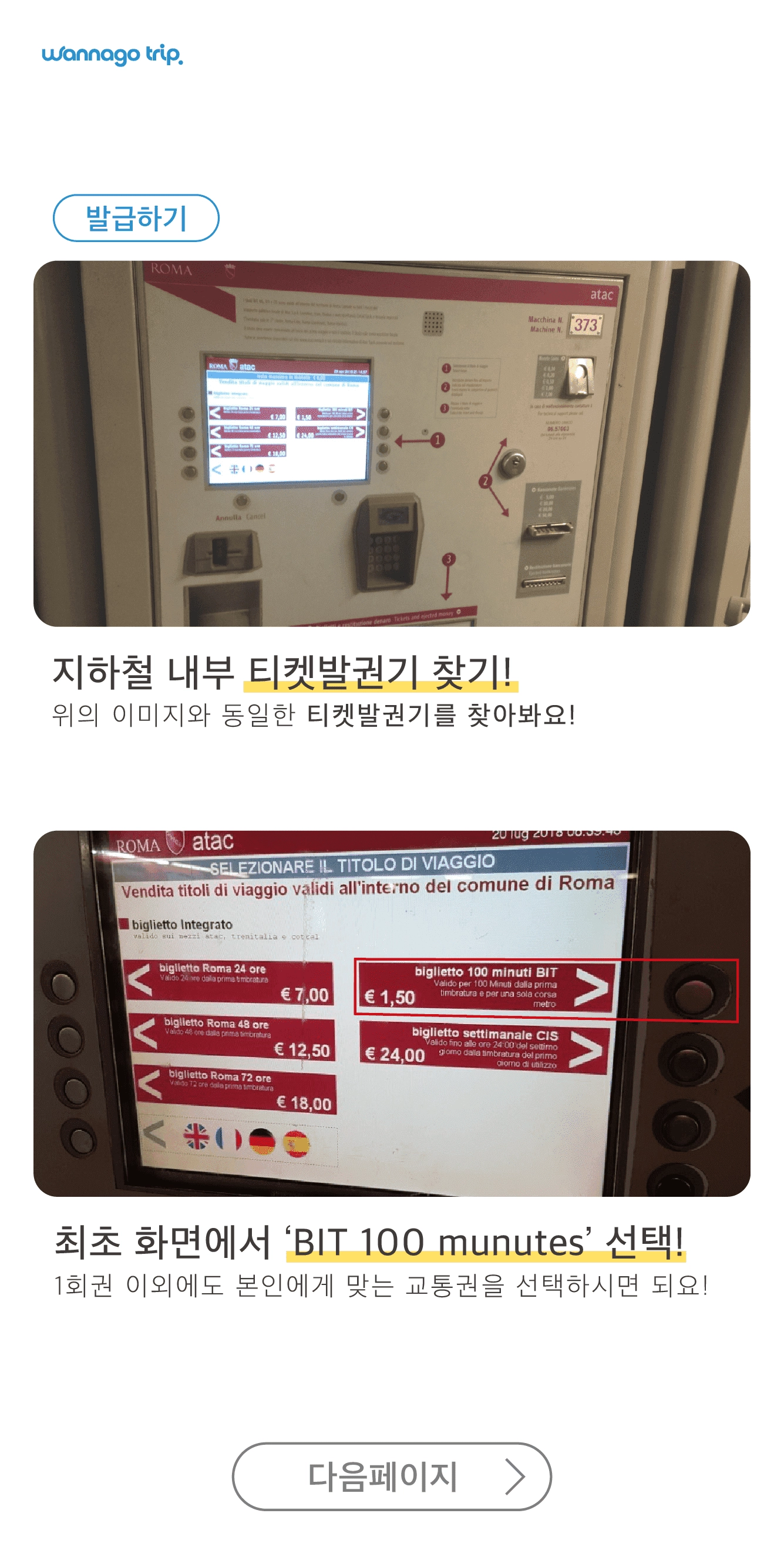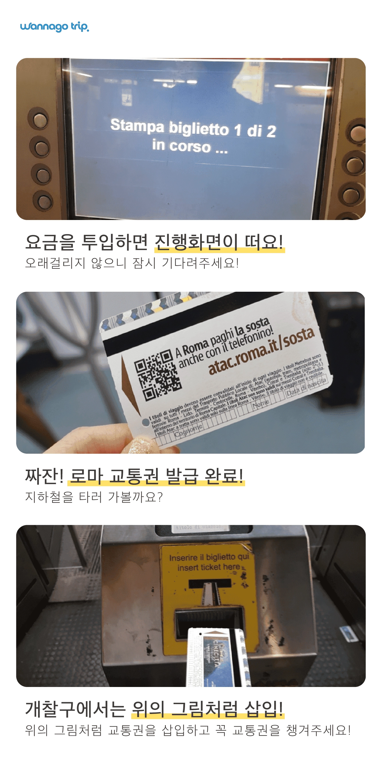 교통권 구입 없이 콘택트리스 카드로 지하철 탑승할 수 있습니다. 단, 콘택트리스 카드로 버스에 탑승하는 것은 조심해야 해요. 콘택트리스 카드 태그(버스 앞쪽) 후 승인까지 시간차가 있기 때문에 카드를 태그하였음에도 불구하고 처리가 제때 되지 않아 벌금을 낸 사례가 많답니다. 로마 검표원은 여행지 주변으로 수시로 검표를 다니니 안전하게 티켓 펀칭과 유효시간 꼭 확인하기!