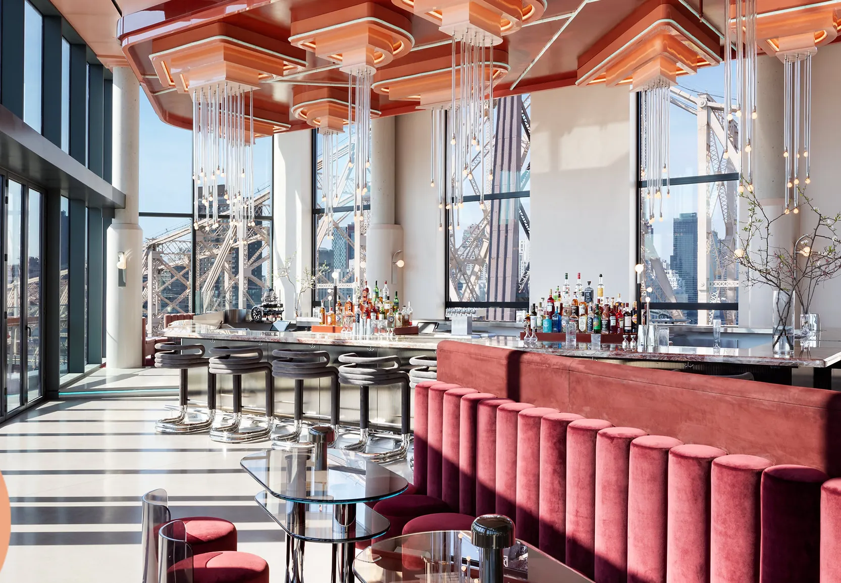 탁 트인 유리창이 있어 실내에서도 뉴욕의 전망을 볼 수 있고, 테라스에 나갈 수도 있어요